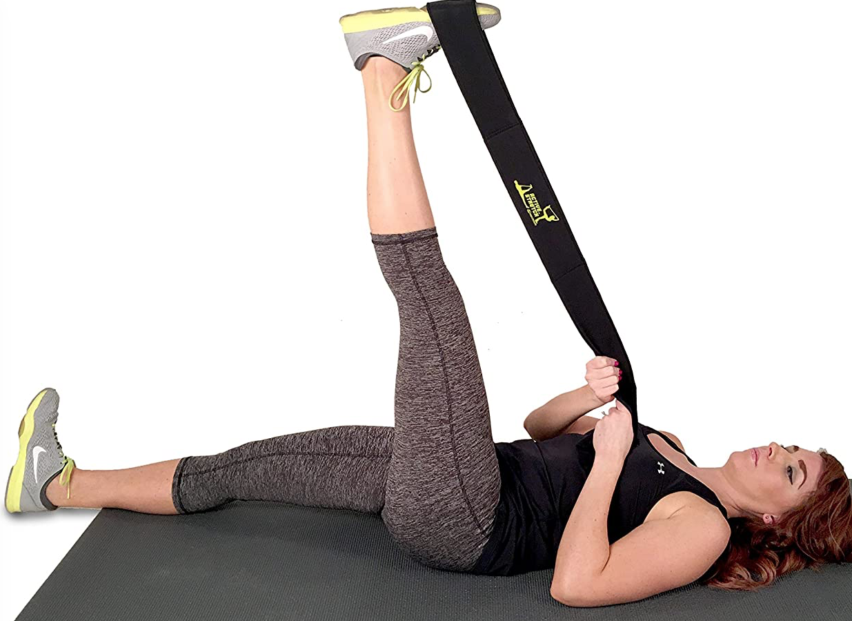 Lie supine, loop a strap around one foot. Extend the leg and gently stretch with a slight bend in the knee. Inhale into the back of the leg. Let the opposite leg be heavy on the floor.