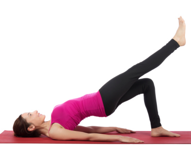 Lying on your back, bend knees & have both feet together, pressing into the ground. Slowly lower your gluts just hovering an inch above the ground, Then slowly press through your feet back up into contracting all the muscles in your legs. At the top of the repetition, squeeze your legs and focus on contracting you gluts. Do three sets of, as many repetitions, as it takes to feel a fatigue in your gluts for the last 3 repetitions.